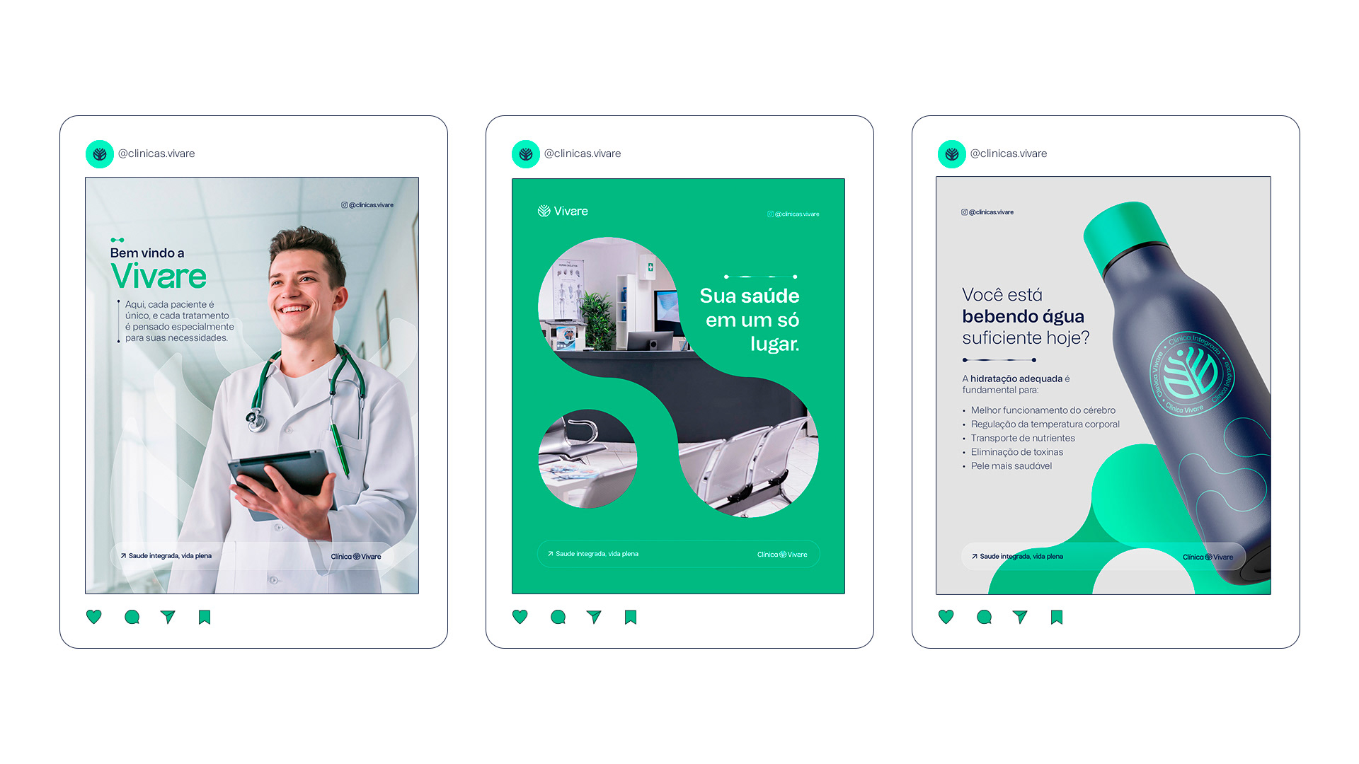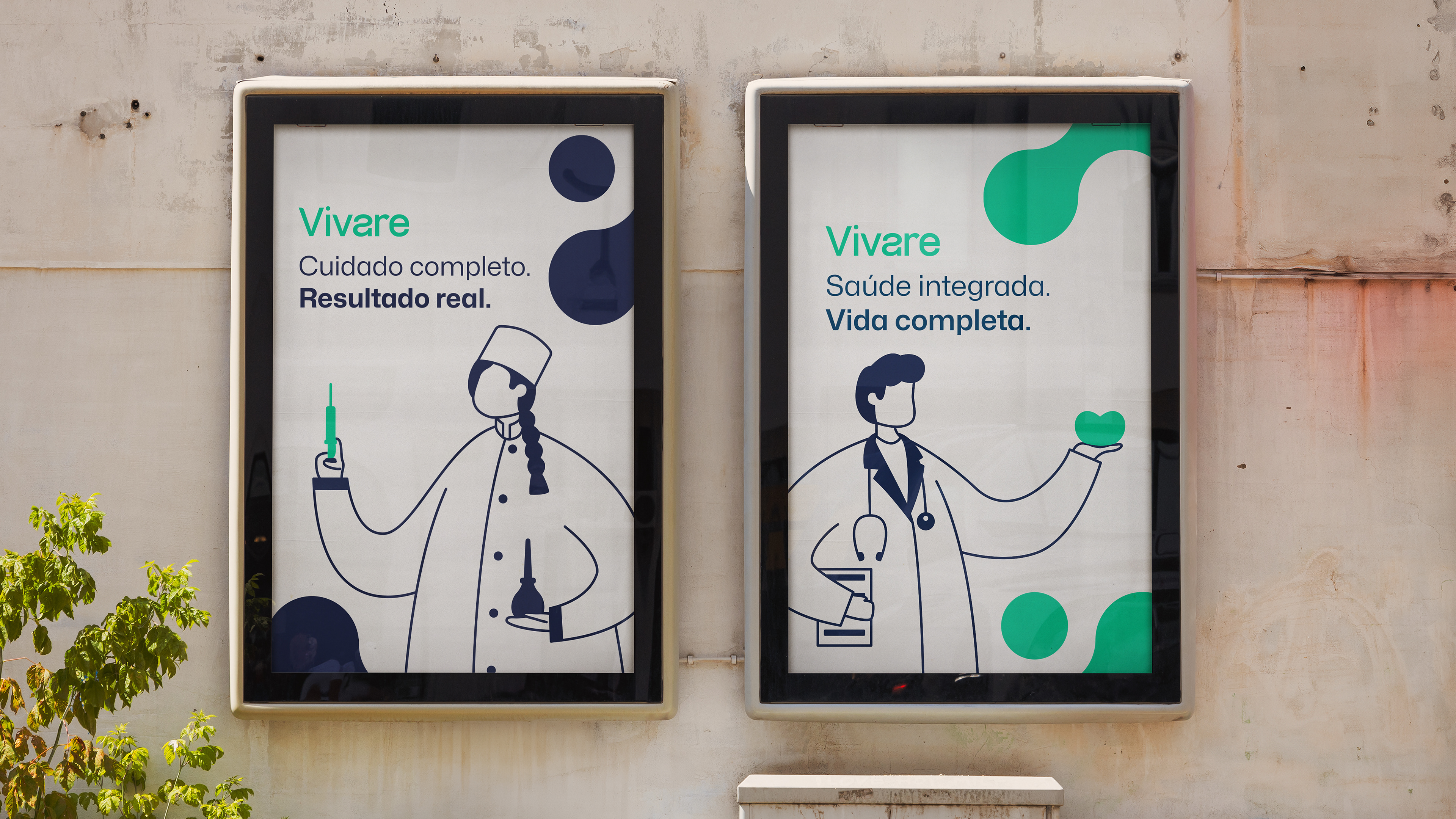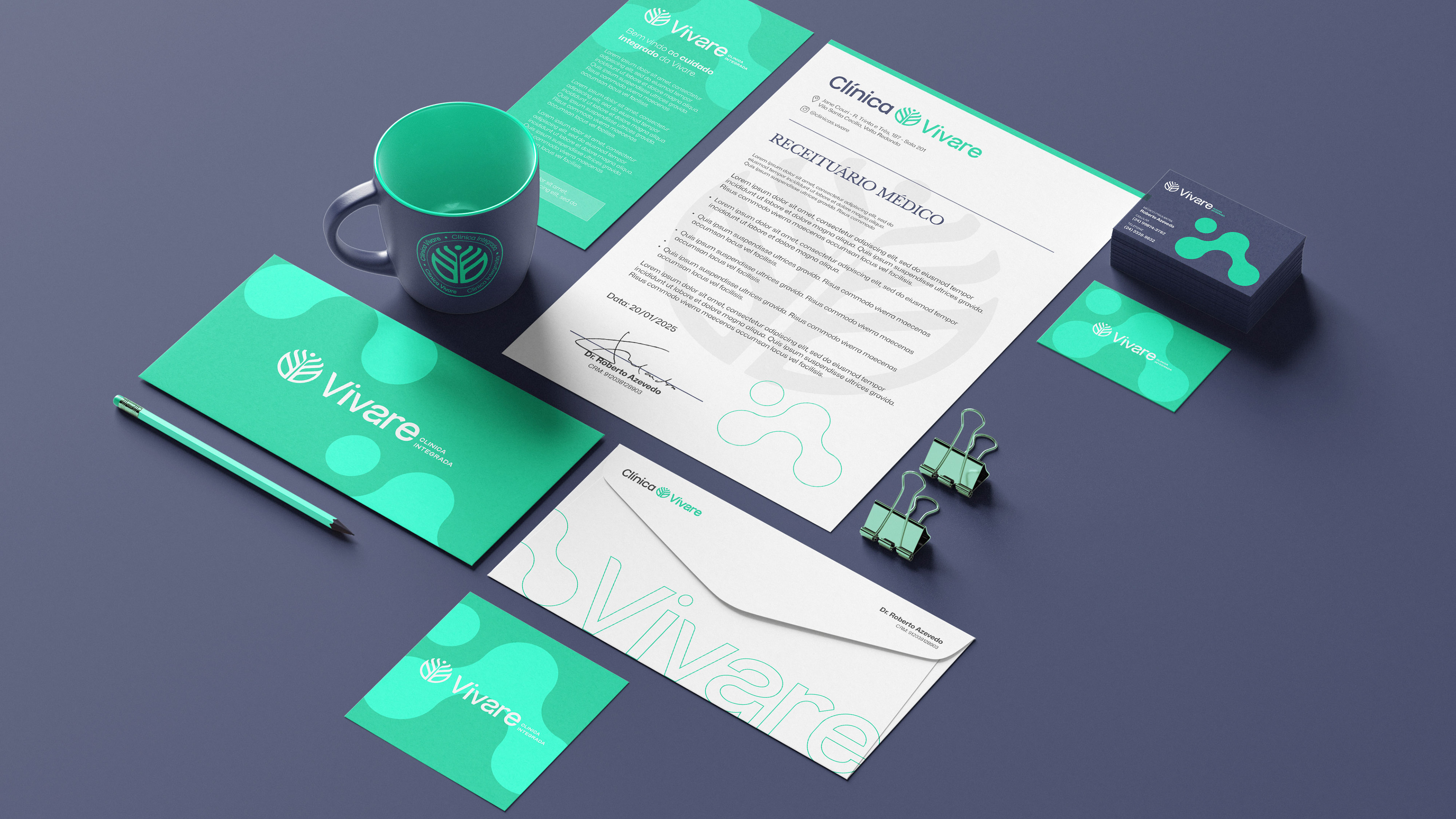 O desenvolvimento da identidade visual seguiu esse mesmo direcionamento. As escolhas de cores, tipografia e elementos gráficos foram pensadas para criar uma linguagem visual leve, acolhedora e ao mesmo tempo segura, capaz de funcionar tanto no ambiente físico da clínica quanto nos canais digitais. Mais do que um conjunto estético, a identidade foi estruturada como um sistema flexível, preparado para acompanhar o crescimento da Vivare e manter consistência em diferentes aplicações e pontos de contato.