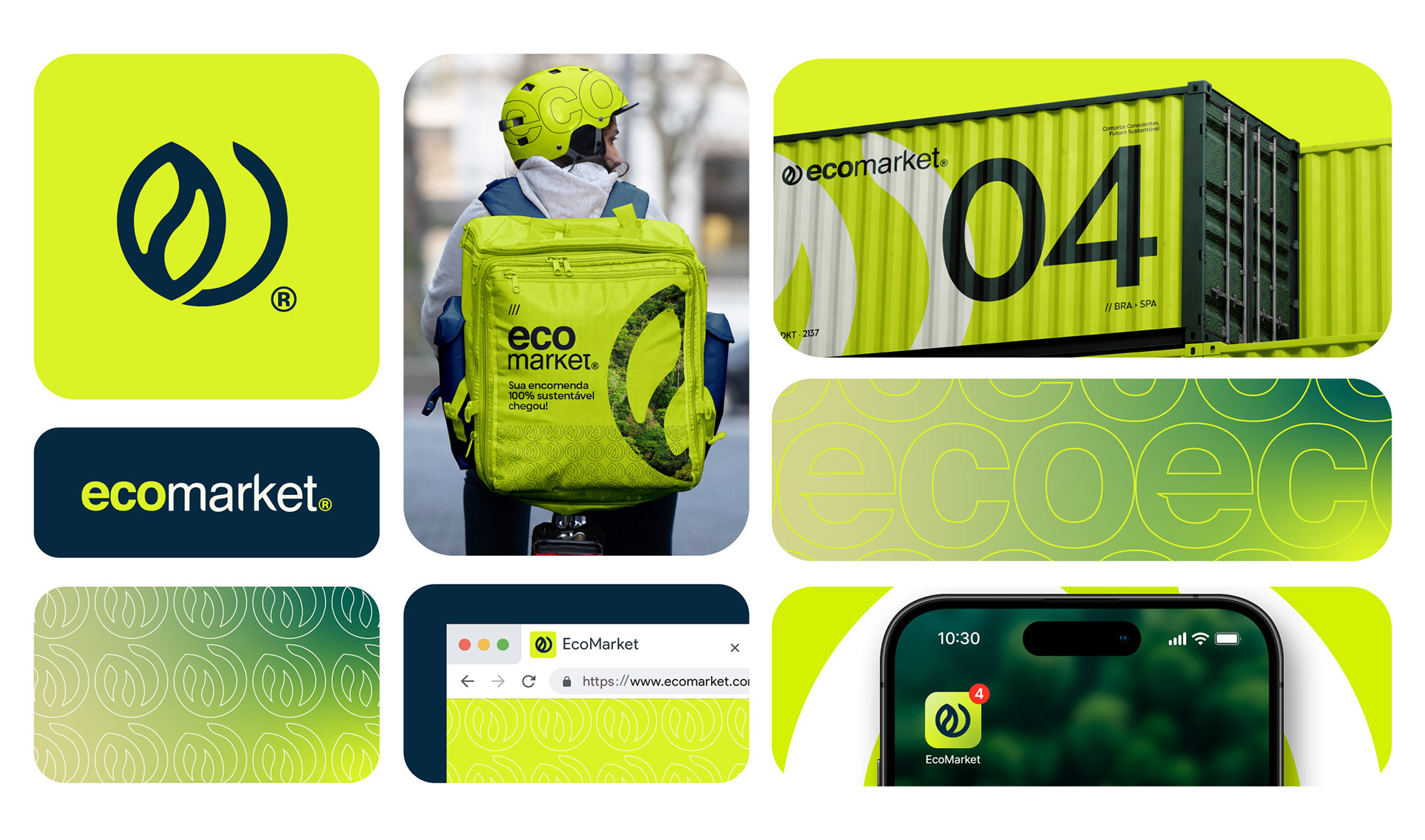The creation of the EcoMarket logo was guided by a minimalist concept, aiming for simplicity and elegance. The central idea was to combine the letter "E" of EcoMarket, which also alludes to electronics and e-commerce, with the shape of a leaf, a universal symbol of nature and sustainability.